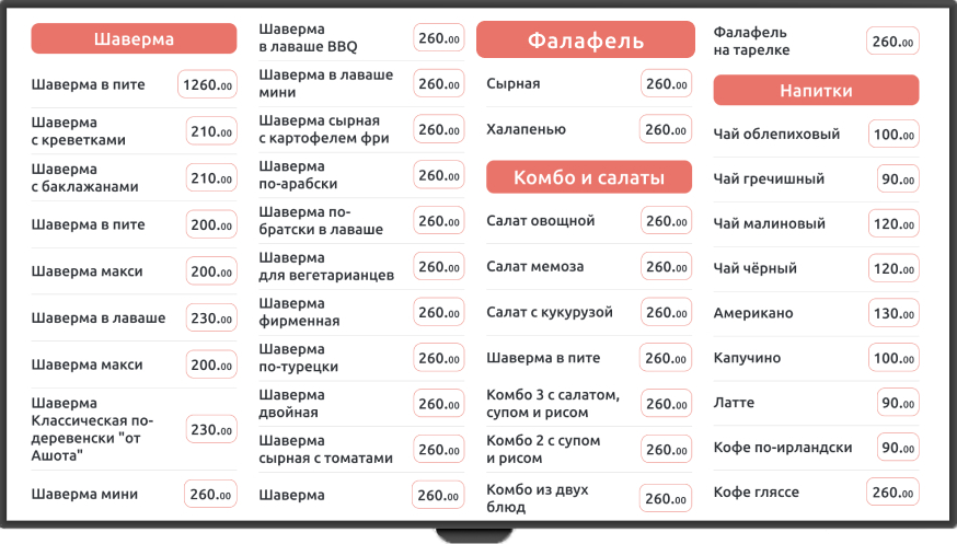 Электронное меню отображает все доступные для заказа блюда и товары.