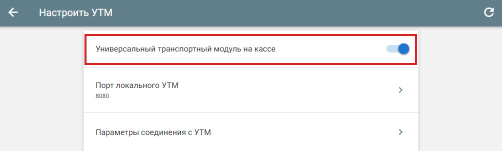 Меню → «Настройка» → «ЕГАИС» → включите переключатель «Универсальный транспортный модуль на кассе»