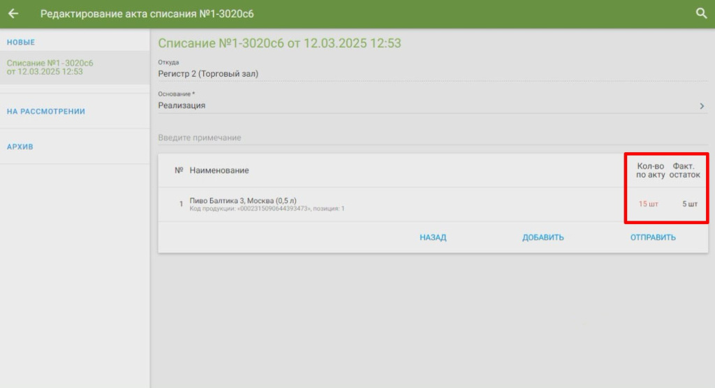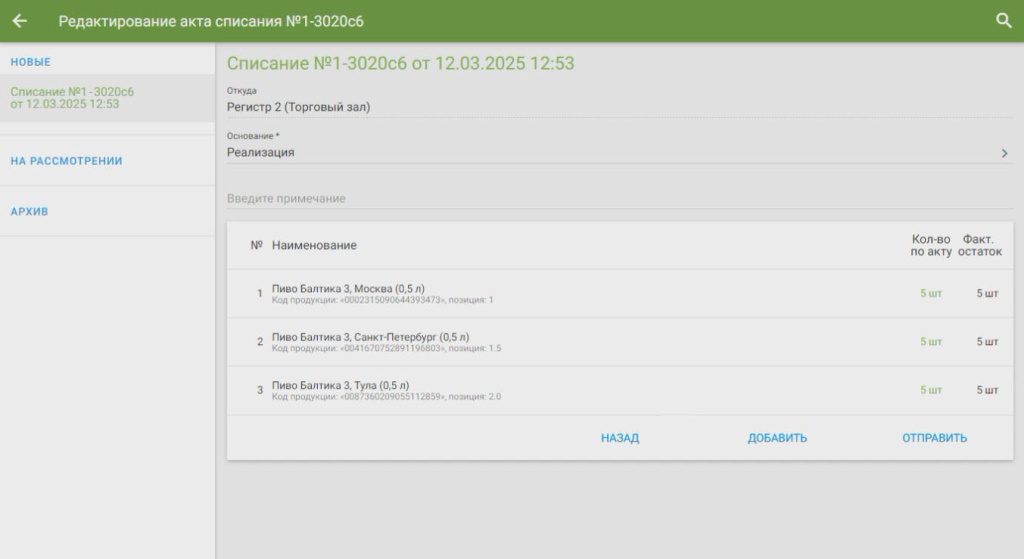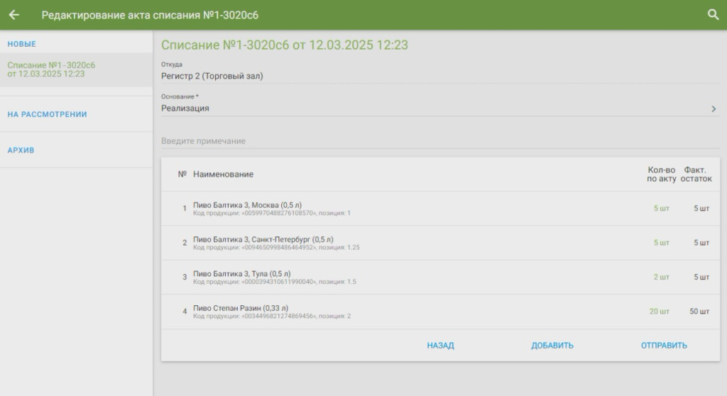 Касса автоматически создаст акт списания с реализованными товарами за выбранный период. Списание пива, слабоалкогольных напитков и неакцизного алкоголя происходит с «Регистр 2 (Торговый зал)» → В поле «Основание» выберите причину «Реализация» → По необходимости введите примечание → Нажмите «Отправить» → «Подтвердить»