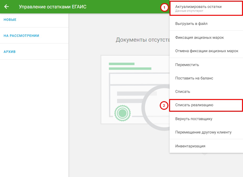 Первым шагом актуализируйте остатки. Для этого перейдите в раздел «ЕГАИС» → Откройте меню в правом верхнем углу экрана, нажав на три точки → «Управление остатками» → «Актуализировать остатки» (1)