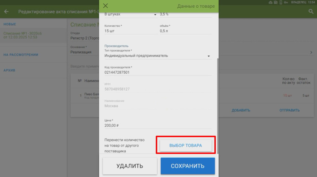 Такая ситуация возникает в тех случаях, когда товару присвоен один штрихкод, а сам товар получен от разных поставщиков. Чтобы составить корректный акт списания, перенесите часть товара на другого поставщика.