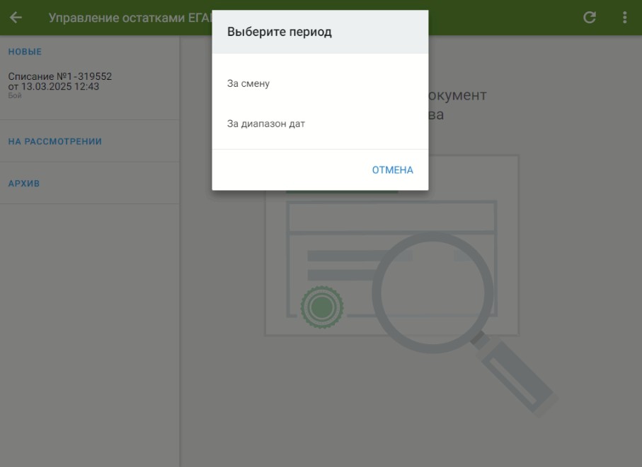 Документ по списанию отправлен в ЕГАИС и перемещен в раздел «На рассмотрении»