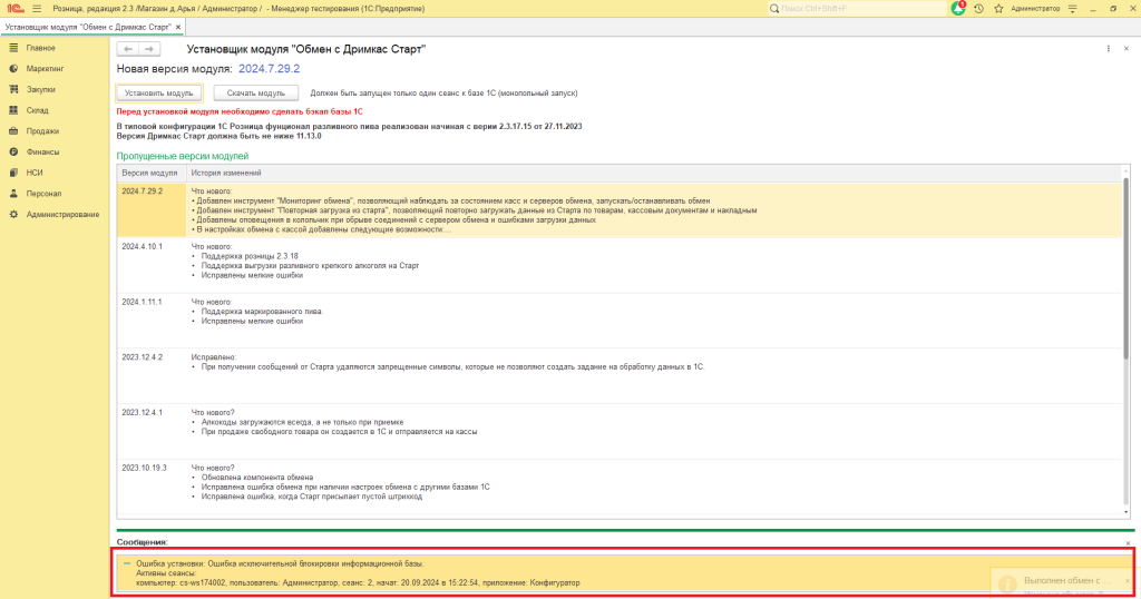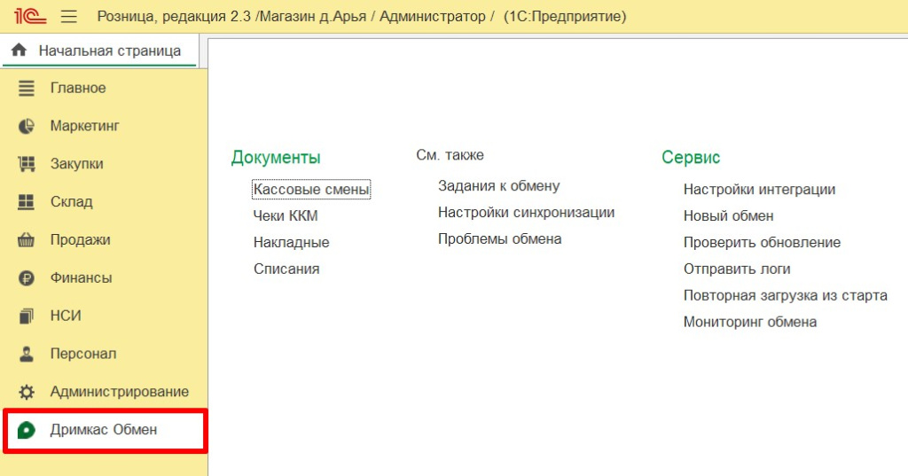 Закройте конфигуратор и вернитесь в программу 1С. В левой части экрана появится раздел «Дримкас Обмен»