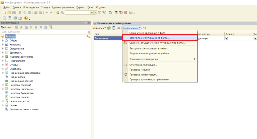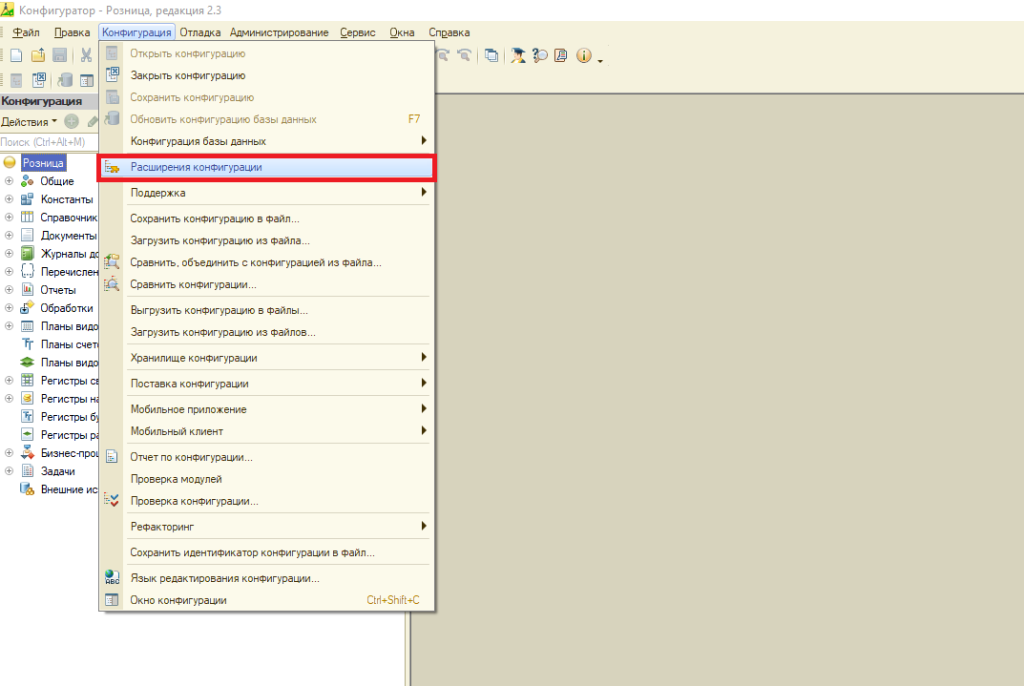 Дождитесь окончания загрузки и откройте конфигуратор 1С. Далее перейдите в меню «Конфигурация» → «Расширение конфигурации»
