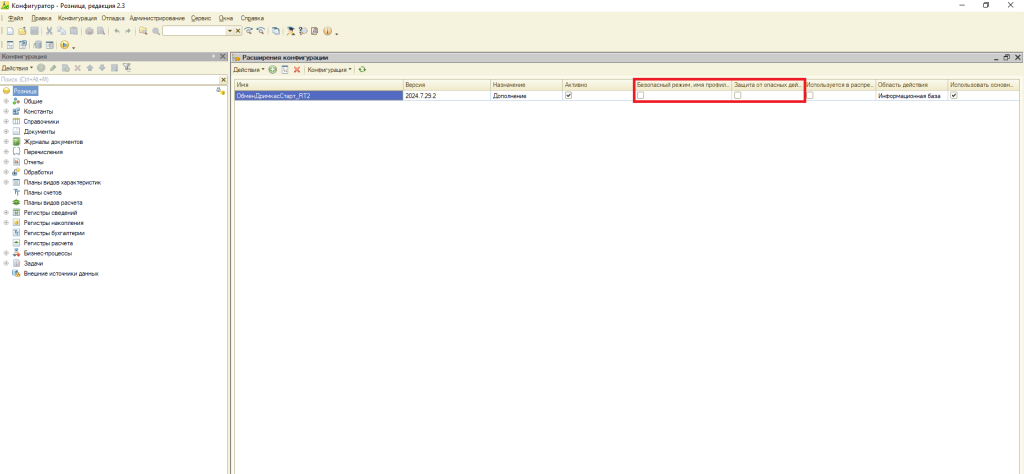 Откройте настройку конфигурации обмена, нажав на «ОбменДримкасСтарт_RT2» и уберите галочки с полей «Безопасный режим, имя профиля» и «Защита от опасных действий»