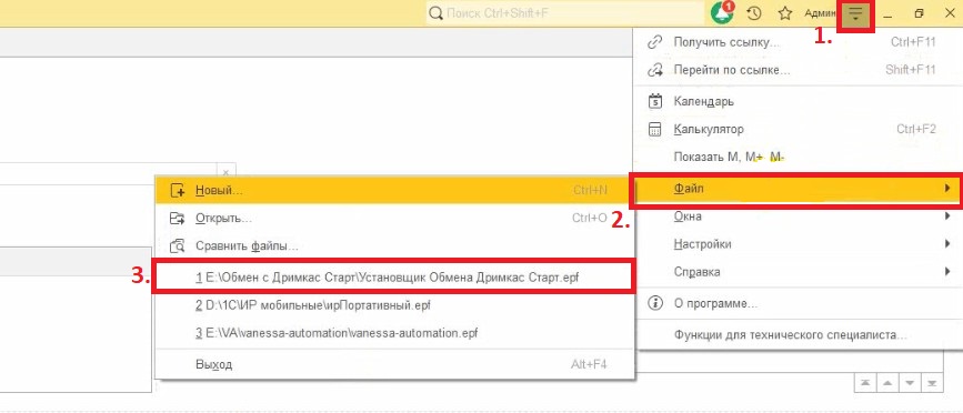 В 1С перейдите в меню → «Файл» → «Открыть» → Выберите в проводнике скачанный файл