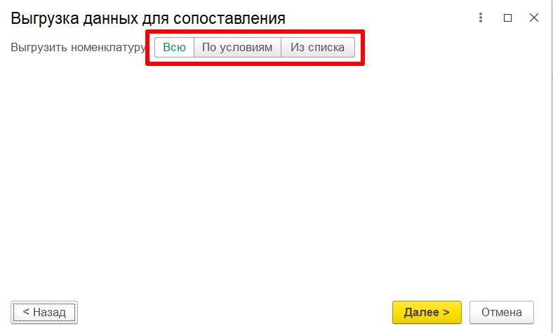 «По условиям» - будет выгружена номенклатура, удовлетворяющая выбранным условиям.