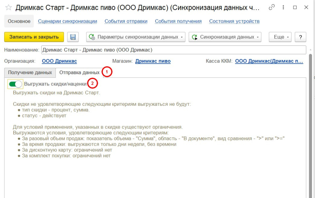 Если вы хотите передавать на кассу скидки и наценки, которые вы устанавливаете в своей товароучетной системе, то перейдите во вкладку «Отправка данных» и включите тумблер «Выгружать скидки/наценки»