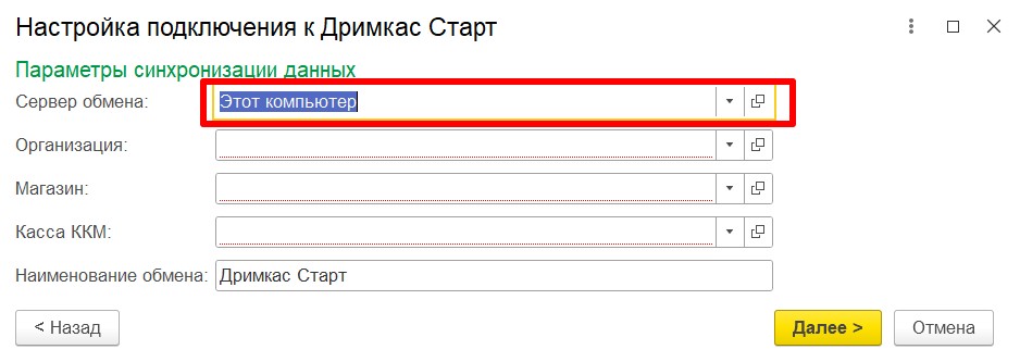 «Сервер обмена» из выдающего списка выберите сервер, через который настраиваете обмен. Если 1С и касса находятся в одной локальной сети, то выберите пункт «Этот компьютер»
