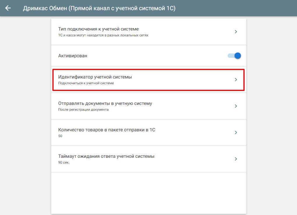 Запустите кассовую программу → Перейдите в «Настройки» → «Обмен с 1С» → «Дримкас Обмен (Прямой канал с учетной системой 1С)» → Перейдите в пункт «Идентификатор учетной системы» → Введите пятизначный код, который был сгенерирован в 1С → «Подключить»