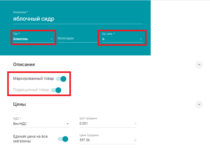 3. Активированы переключатели «Маркированный товар» и «Подакцизный товар»;