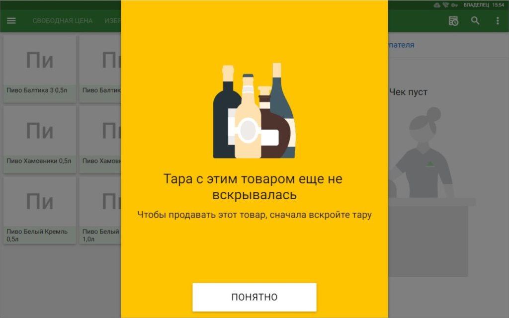 Товар отобразится в чеке, для завершения нажмите кнопку «Оформить вскрытие тары». Касса напечатает чек. Сохраните его - он может пригодиться вам, например, для того чтобы знать когда выйдет срок годности у пива. Тара вскрыта.