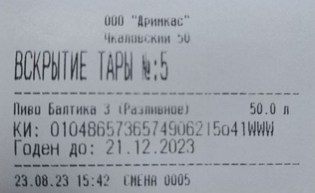 Касса напечатает чек. Сохраните его - он может пригодиться вам, например, для того чтобы знать когда выйдет срок годности у пива.