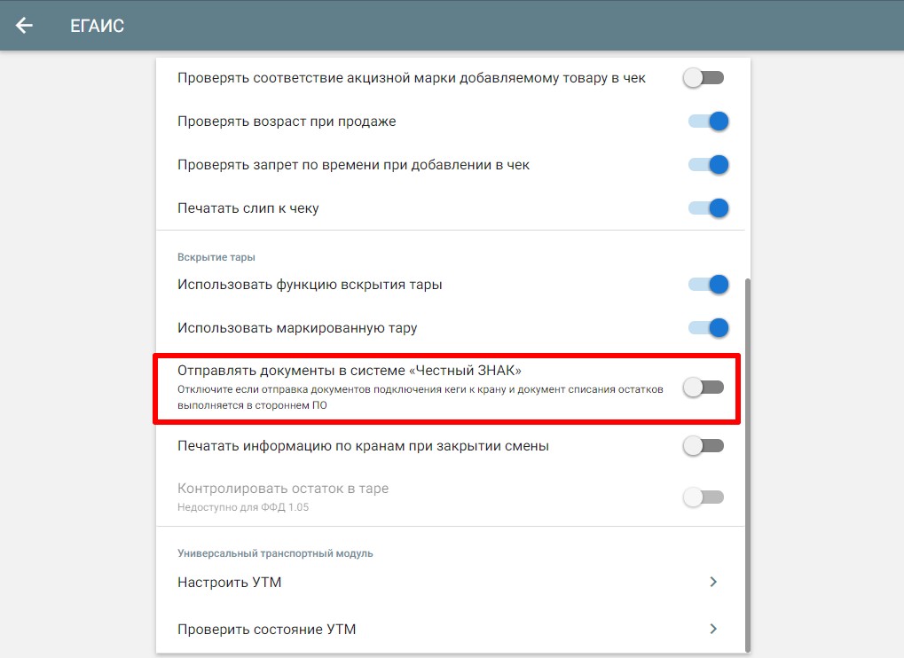 Для начала отключите функцию отправки документов в «Честный знак». Для этого перейдите в «Меню» → «Настройки» → «ЕГАИС» и отключите пункт «Отправлять документы в системе «Честный знак».
