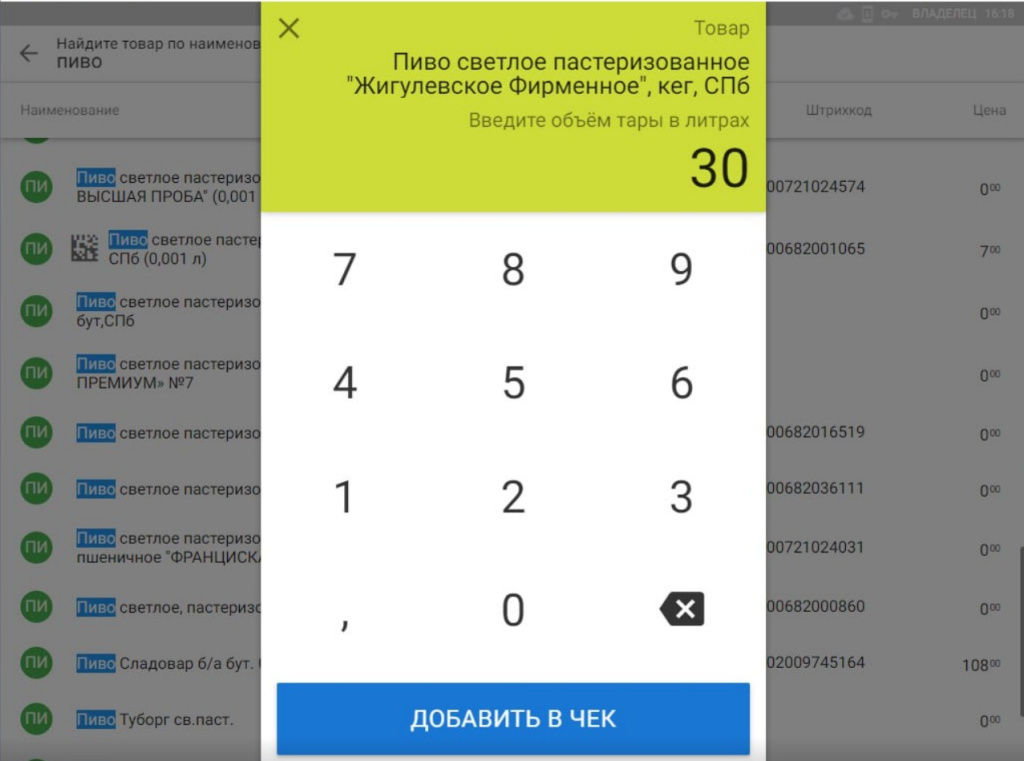 Затем ещё раз добавьте товар и укажите количество 4,5 литра. Так как из вскрытой кеги всё количество пива уже продано, то Дримкас Старт выведет соответствующее сообщение.