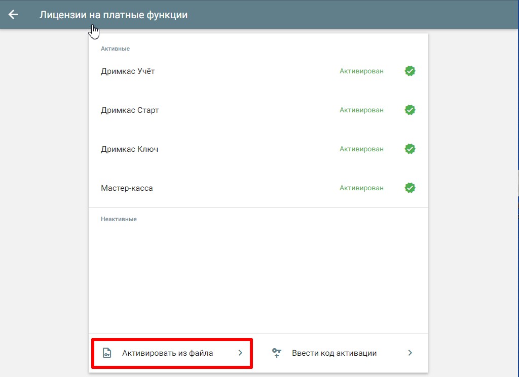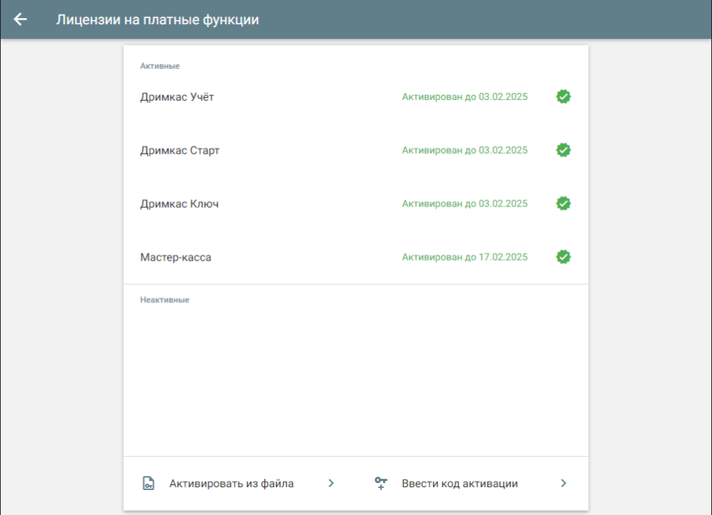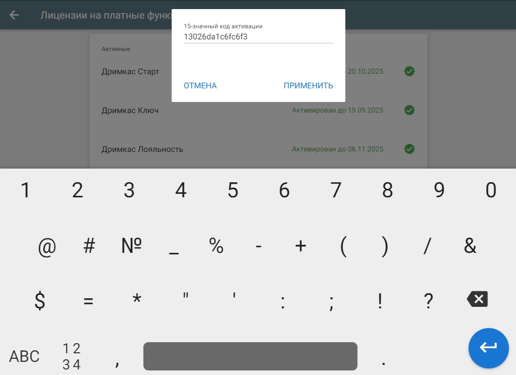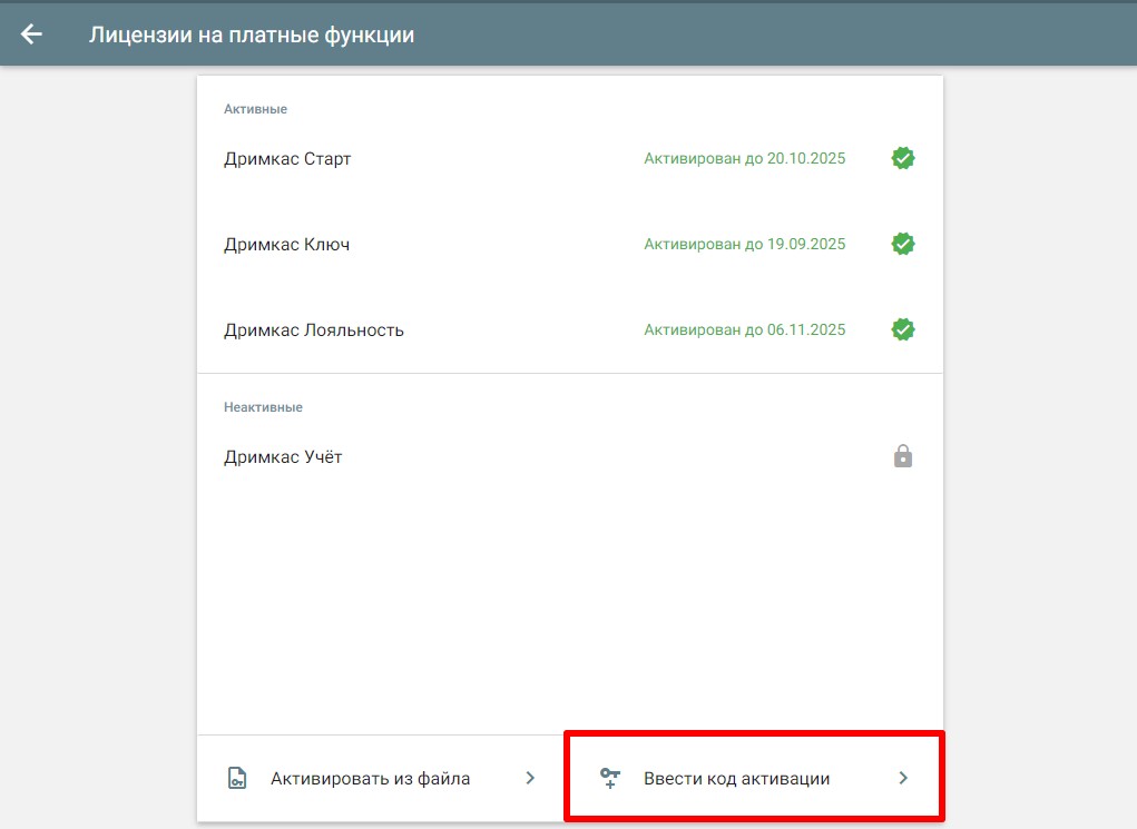 Если вы не используете Кабинет Дримкас, то лицензию можно активировать в кассовой программе. Перейдите в «Меню» → «Настройки» → «Об устройстве» → «Лицензии на платные функции» → «Ввести код активации»
