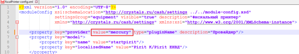 Сохраните изменения в файле. Затем откройте файл C:\Dreamkas\Start\crystal-cash\config\modules\fiscalPrinter-config и пропишите параметр value="mercury"