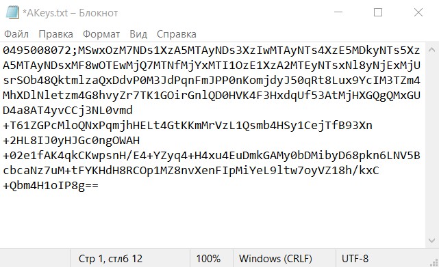 Чтобы активировать ключ из файла, создайте в блокноте файл «AKeys» с разрешением «.txt» → Пропишите в нем заводской номер кассы и длинный ключ в формате «Заводской номер КТТ;Длинный ключ» → Сохраните файл.