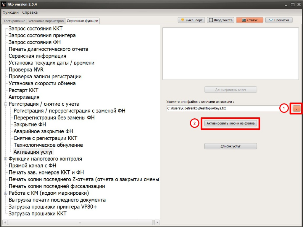 Далее вернитесь в утилиту «Fito» и нажмите на кнопку «.» → Укажите путь до файла и нажмите «Активировать ключи из файла»