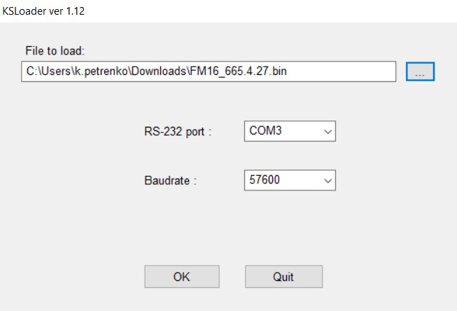 Откройте «KSL» → в поле «File to load» нажмите «...» и укажите путь к файлу прошивки → в поле «RS-232 port» укажите порт из шага 3 → в поле «Baudrate» установите значение «57600» → нажмите «ОК» → дождитесь окончания прошивки платы и нажмите «Quit»