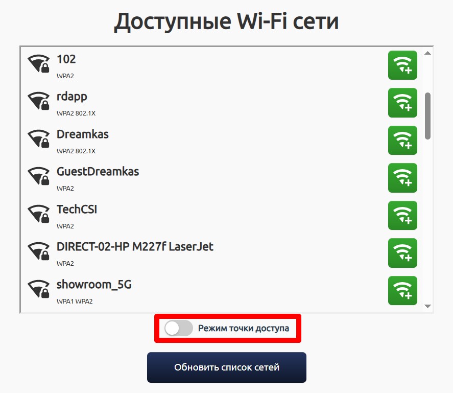 В браузере перейдите на домашнюю страницу устройства по сетевому имени «viki BOX.local» или «присвоенное_имя.local» → Нажмите кнопку «Wi-Fi» → Включите тумблер «Режим точки доступа»