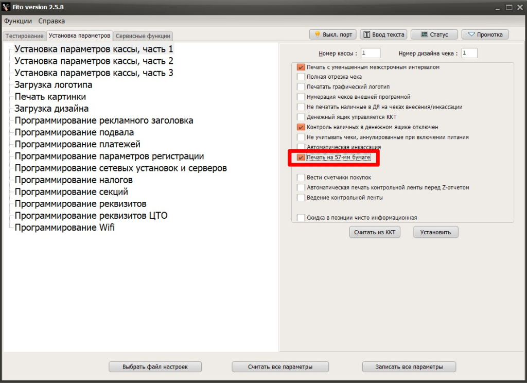 Далее подключитесь к Вики Принту с помощью сервисной утилиты Fito (версия не ниже 2.3.20) → Перейдите на вкладку «Установка параметров» → Выберите пункт «Установка параметров кассы, часть 1» → Выберите «Печать на 57-мм бумаге» → Нажмите кнопку «Установить».