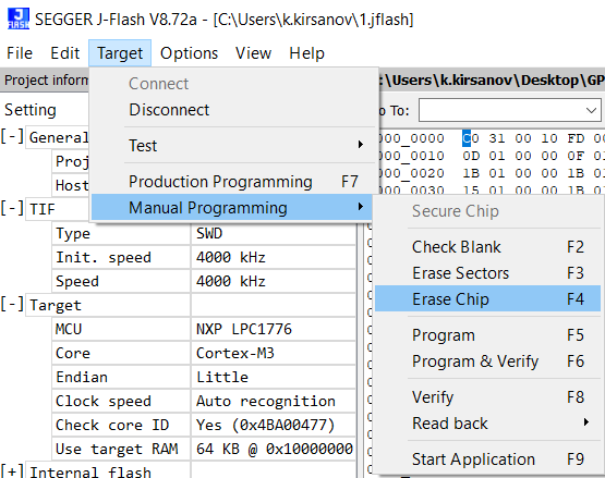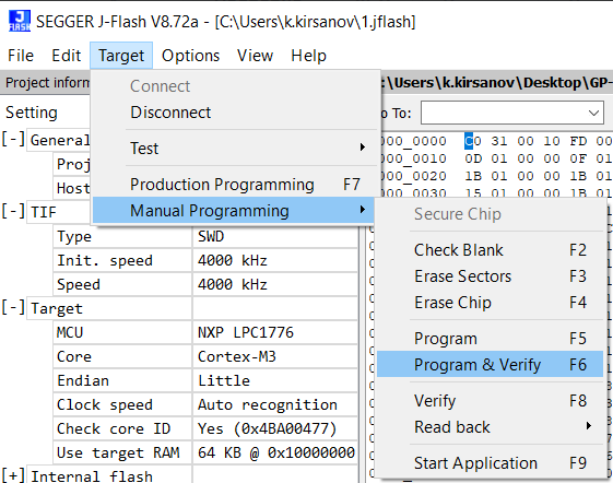 - Снова в меню Target, перейдите к Manual Programming → Program & Verify.