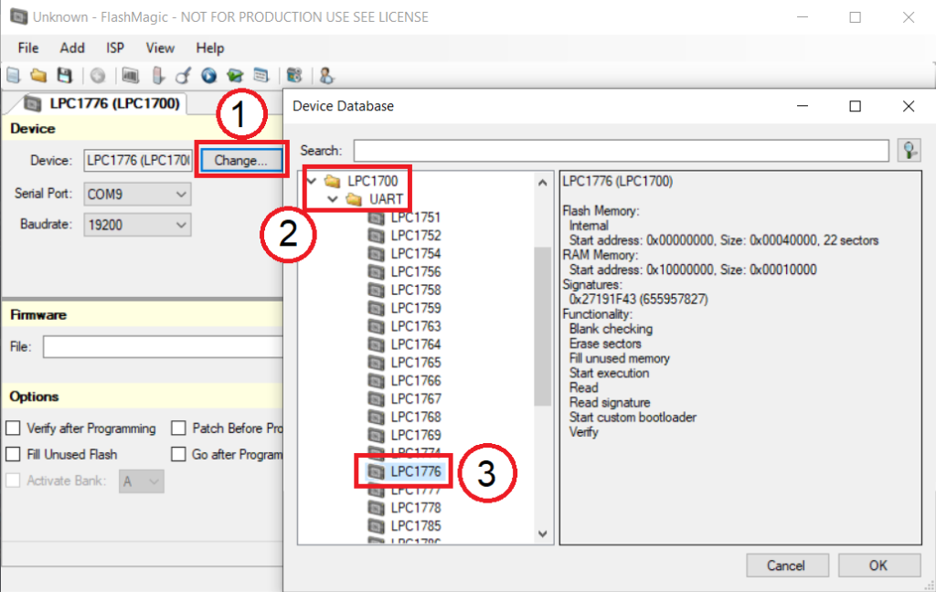 - Запустите утилиту Flash Magic. В меню Device нажмите на кнопку Change, в открывшемся окне перейдите в папку LPC1700 → UART, в ней выберите LPC1776 и нажмите OK.