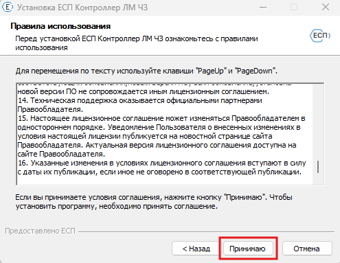 Для принятия лицензионного соглашения прокрутите его текст до конца и нажмите Принимаю.